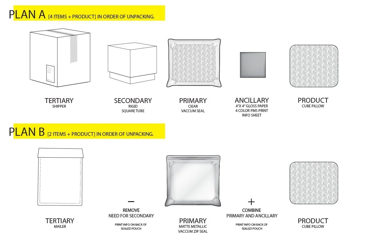 we created a pitch deck for pillow cube’s packaging, we wanted to illustrate and educate the client on 2 different directions we could help them take to reduce the foot print of their product to save money on shipping while building their brand identity.